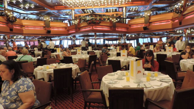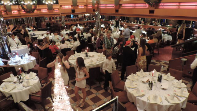 Y luego de perderme 80 veces y lograr dominar más o menos los lugares del barco, de haber tomado sol, de escuchar buena música, en definitiva, de divertirme, llegó el momento de compartir la primera cena. Teníamos el último turno, digo último porque hay dos posibilidades: 19.30 hs. ó 22.00 hs. Consejo: Considero que elegir el último turno es lo mejor, porque si hacés una excursión en parada te da tiempo suficiente para poder tomar un buen baño, arreglarte y no estar a las corridas. En definitiva estás de vacaciones.