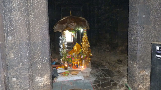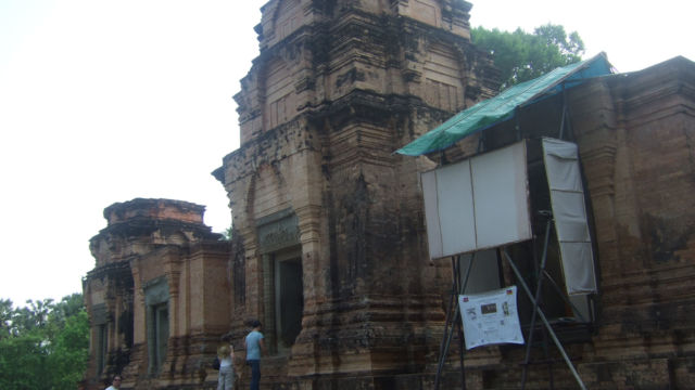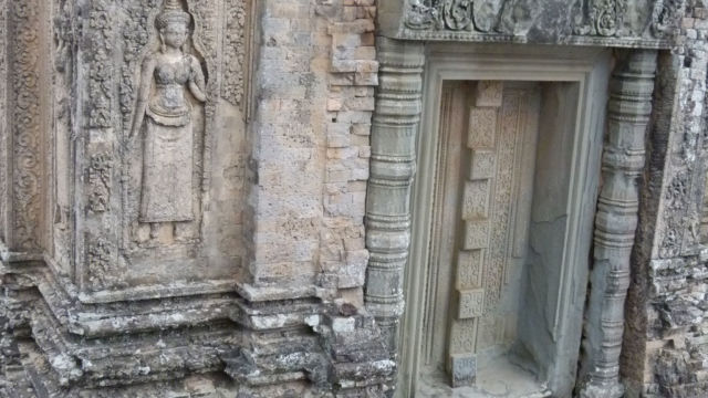 A pesar del cansancio del viaje, hicimos nuestra primera visita a los Templos de Prasat Kravan ( Khmer : ប្រាសាទ ក្រវាន់), con sus especiales y únicas esculturas de ladrillo… Este templo fue dedicado al dios Vishnú y construido en la primera mitad del siglo X. Está ubicado al este de Angkor Wat y el sur de Banteay Kdei. Las tallas de ladrillo en el interior de este monumento son únicos en la arquitectura Jemer. Y lo increíble es que las torres que forman una sola fila, cinco en total, están casi todas en perfecto estado.
