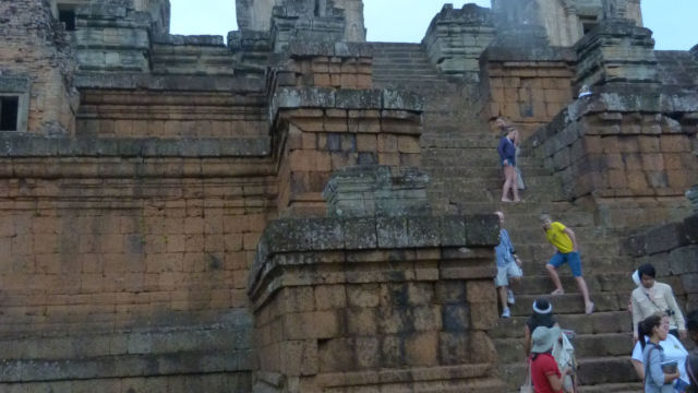 Ahora le toca el turno al templo de Pre Rup (en camboyano, ប្រាសាទប្រែរូប), templo hinduista, consagrado en el año 961 al dios Shiva. Es un templo especial porque fue construido casi por entero en ladrillo y laterita. Esta razón hace que visualmente sea más cálido y al no estar tan cubierto de moho no se lo ve tan gris y las fotos pueden resultar más espectaculares. A este templo nos llevó nuestro guía para que disfrutemos de la puesta de sol…