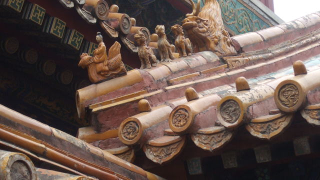 Pero, evidentemente, no solo hay que mirar al piso mientras caminas por el Palacio Imperial, es casi una obligación levantar la mirada. Te asombrarás de lo que verás en los techos de los pabellones y confirmarás lo que te estoy contando, respecto de los dragones. Cada pabellón tiene una cantidad de estatuillas de animales, llamadas «linternones» y de acuerdo a la cantidad que se coloque da determinada importancia al edificio. Su origen es muy antiguo, data de la época Han. Por ejemplo, un edificio de menor rango dentro de la Ciudad Prohibida puede tener 3 «linternones» y el de mayor jerarquía, el «Salón de la Armonía Suprema», cuenta con 10. Siempre un dragón cierra la comitiva de esa hilera de estatuillas, siempre. Pero no solo daban jerarquía sino que también ahuyentaban a los malos espíritus.