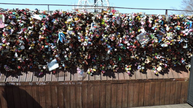 Yo estaba informada de este lugar, pero Alfredo no tenía ni idea. Y cuando vió la cantidad de candados que la gente ponía allí, dijo: «No trajimos el nuestro, que pena». Pero yo no me preocupé. Lo distraje un rato hasta que, por fin, pude sacar el candado que llevaba en mi mochila «guardado» para esta ocasión. Así es que hoy, ahí, en este espacio verde ubicado en pleno centro de la ciudad de Seúl está nuestro candado que hemos puesto pidiendo los deseos correspondientes.