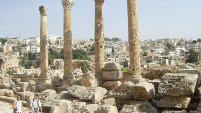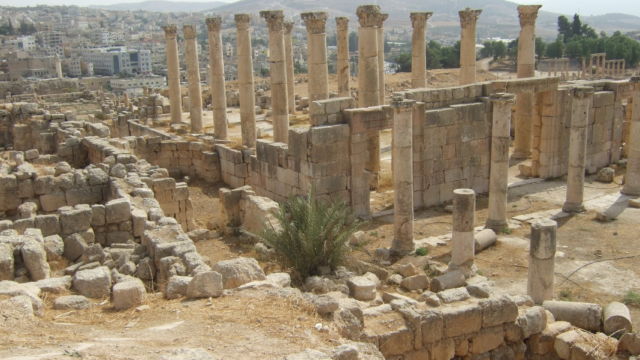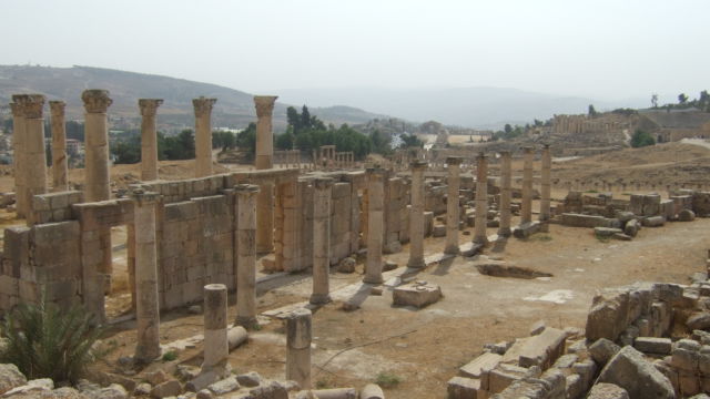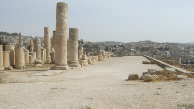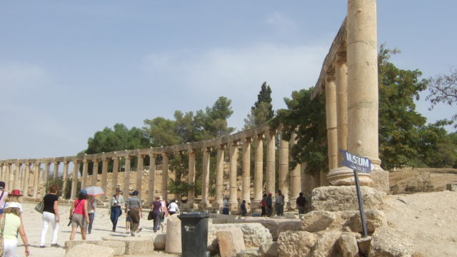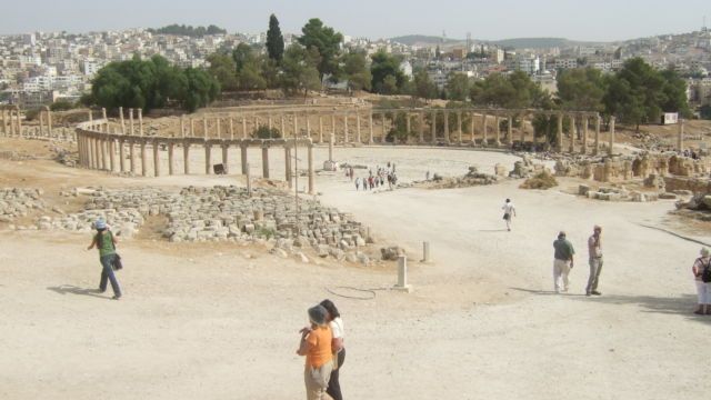 Aparece ante nosotros el «Foro de Gerasa», una deslumbrante plaza oval con el eje mayor de 91 metros de largo por 80 de ancho, rodeada de 56 columnas de estilo jónico que, hace tiempo y a lo lejos, solían alojar tiendas comerciales. Según relatan el Foro de Jerash tenía meramente una función económica, no política o religioso.