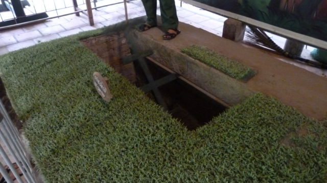 Y llegó el momento en que nuestro guía nos sugirió si queríamos ingresar a uno de los Túneles de CuChi. Teníamos dos opciones, un túnel corto u otro más largo. Yo elegí hacer el más corto, en cambio Alfredo no fué de la partida. Los túneles no son los «originales», fueron adaptados para que nosotros, los visitantes, pudiésemos pasar. Lo mío duró apenas tres minutos y les garantizo que me alegró sobremanera volver a ver la luz y respirar aire puro. Sonreí a pesar de todo. Esto me sirvió para imaginarme como habría sido la vida allí abajo, siempre doblados en dos, sin aire, sin luz, porque siempre estaban en «cuclillas»… solo en algunos de los lugares claves como la cocina o los dormitorios podían estar parados.